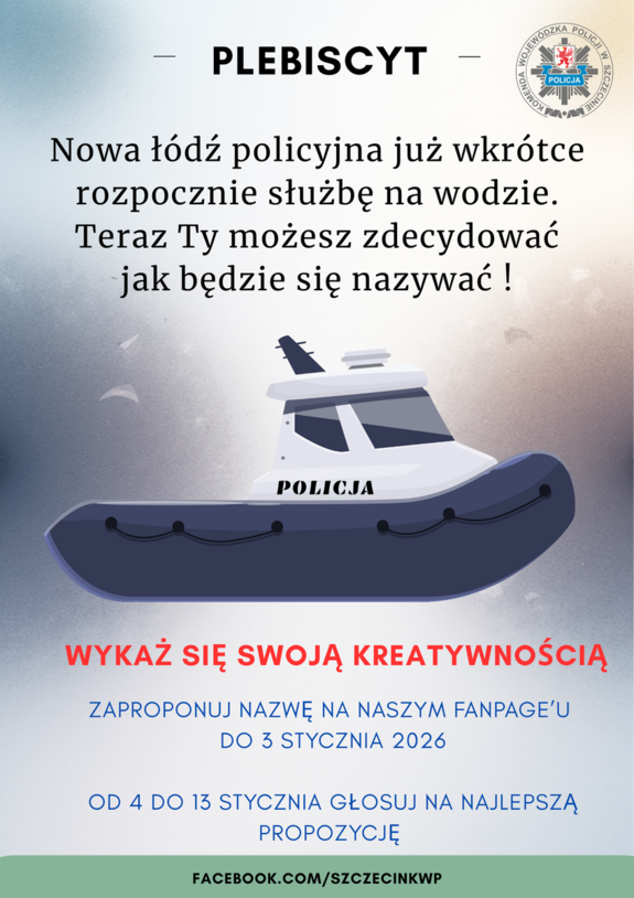 Witajcie miłośnicy marynistyki i nowoczesnego sprzętu pływającego! Ogłaszamy plebiscyt na nazwę dla nowej łodzi Komisariatu Wodnego Policji w Szczecinie. Aby wziąć udział w naszej akcji, wystarczy odrobina kreatywności i nieograniczona wyobraźnia. Umieść swoją propozycję w komentarzu naszego posta na platformie Facebook. Nie możemy się doczekać Waszych propozycji. Nagrodą dla zwycięzcy będzie rejs łodzią po akwenie Odra-Dąbie oraz symboliczny tytuł matki/ojca chrzestnego jednostki. Dołącz do zabawy i weź udział w naszym konkursie.